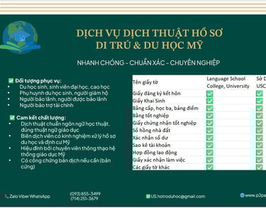 Cần dịch thuật hồ sơ du học, định cư hoặc bảo lãnh di trú Mỹ? Chúng tôi cung cấp dịch vụ dịch hồ sơ học bạ, bảng điểm, bằng cấp, giấy tờ cá nhân nhanh chóng, chính xác, đúng chuẩn các trường đại học và sở di trú Mỹ yêu cầu.